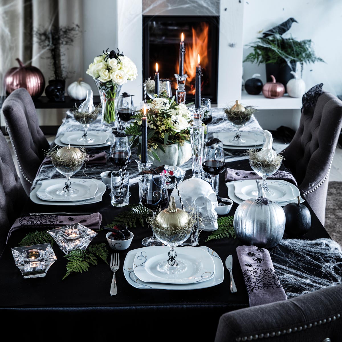 Biel porcelany VICTORIA w halloweenowej aranżacji będzie doskonale kontrastowała z ciemnym, wyrazistym obrusem. A co z dodatkami? Warto zdecydować się na takie w odcieniach srebra, złota czy perłowego różu – oczywiście z połyskiem. Przecież dynie nie muszą być zawsze pomarańczowe! Do tego „straszne motywy” – sztuczne pająki i pajęczyny. I już – halloweenowe przyjęcie w stylu glamour gotowe. Można czekać na gości…