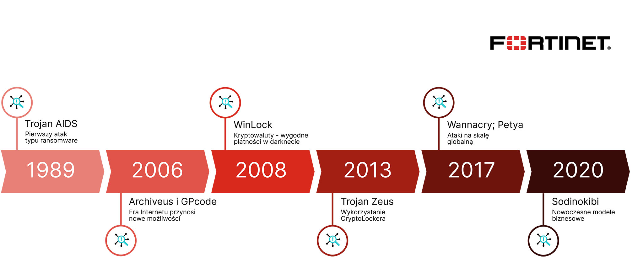 Przychody z cyberprzestępczości z użyciem oprogramowania szyfrującego ransomware wzrosły w 2020 roku o 311% w porównaniu z rokiem poprzednim. Osiągnęły szacunkową wartość 350 milionów dolarów. Według raportu Fortinet „Global Threat Landscape”, obejmującego drugie półrocze 2020 roku, w grudniu codziennie na świecie 17,2 tys. urządzeń stawało się celem ataków tego typu. Obecnie ransomware to zagrożenie wpływające na funkcjonowanie wielu gałęzi gospodarki. Eksperci FortiGuard Labs pokazują drogę, jaką ataki z wykorzystaniem tego narzędzia przeszły w ciągu ostatnich 30 lat – od wykorzystywania dyskietek, aż do usług działających w złożonych modelach
