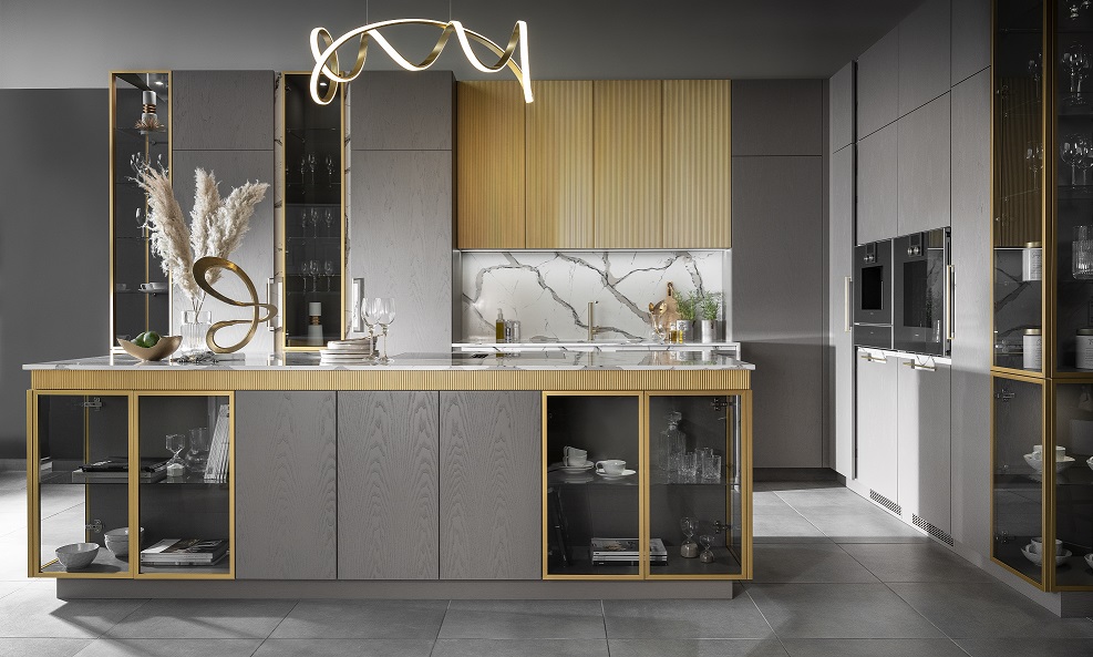 Zastosowanie kunsztownych wycięć pod złote uchwyty, które odsłaniają czarujący biało- beżowy ornament, nadaje wizualnej harmonii. Nowoczesną bryłę kuchni urozmaicają narożne przeszklenia w postaci podświetlonych witryn, pozwalające eksponować kolekcje ulubionych przedmiotów.
