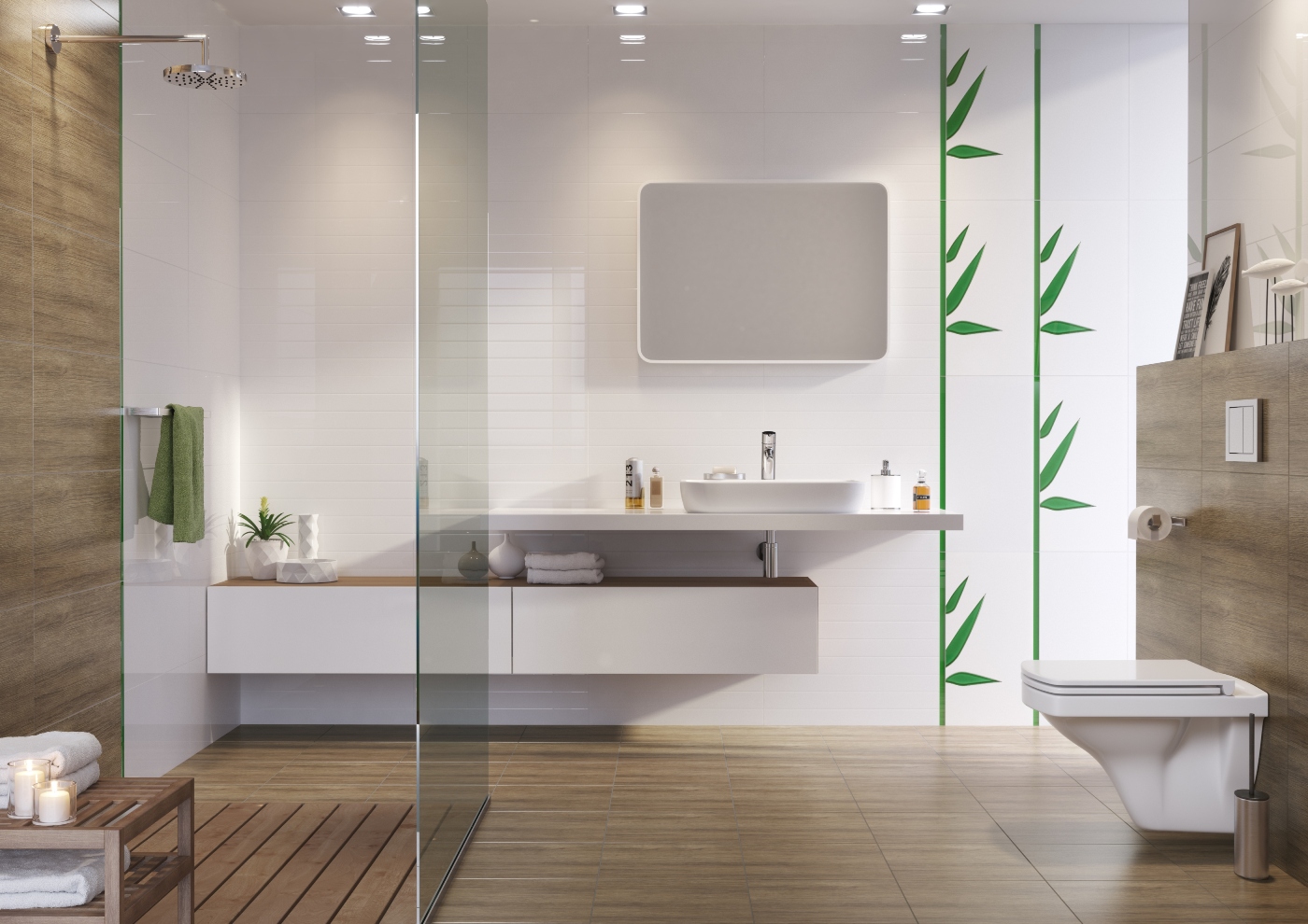 Duży format (29,7×60 cm) płytek ściennych White Glossy Structure, Wood Brown Satin Structure, White Glossy i Wood Brown sprawi, że ułożone poziomo, optycznie powiększą łazienkę, a mniejsza ilość fug przyczyni się do łatwiejszego utrzymania czystości w łazience. Kolekcja Nature daje nam wybór pomiędzy dwoma rodzajami płytek podłogowych w formacie 33,3×33,3 cm – White Glossy dla miłośników klasycznej bieli w błyszczącym wydaniu oraz Wood Brown Satin dla tych, którzy preferują matowy rysunek drewna. Kolekcję uzupełniają elementy dekoracyjne w odcieniach zieleni: Nature Green Inserto Leaf, Nature Green Inferto Velvet A oraz Nature Green Inserto Velvet B (29,7×60 cm), które w połączeniu ze szklanym elementem dekoracyjnym Grass Light Green Border New (2×60 cm) mogą stworzyć nietuzinkową dekorację – bambusowe pędy doskonale komponujące się z rysunkiem drewna na płytkach.