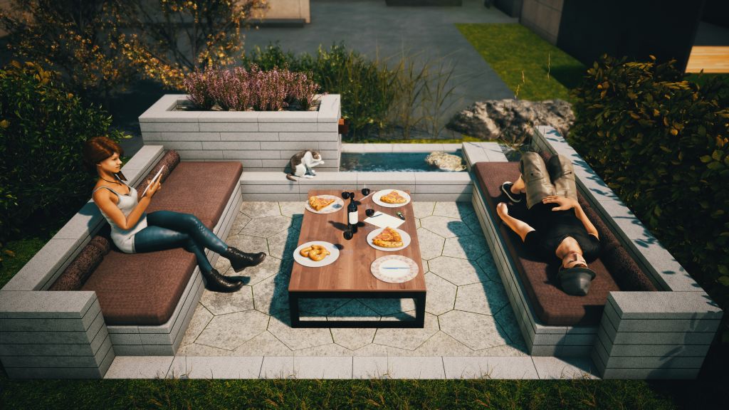 Meble powstałe dzięki nieoczywistym sposobom wykorzystania prefabrykatów betonowych można łączyć w spójne, wieloelementowe kompozycje. Dla przykładu po obydwu stronach betonowej sofy stworzonej z elementów Polbruk Neo można umieścić wykonane z tego samego prefabrykatu kwietniki i posadzić w nich ozdobną zieleń, tak potrzebną do prawdziwego relaksu. Aby zachować modernistyczny charakter aranżacji, a zarazem ukoić zmysły, do stworzonego już wcześniej „kompletu wypoczynkowego” można dołączyć oczko wodne, mini fontannę lub kaskadę ze zbiornikiem, do którego będzie spływała woda. Pozwoli to wprowadzić do otoczenia szum płynącej wody, który działa uspokajająco i skłania do relaksu. Obudowę zbiornika wodnego można bez trudu wykonać na przykład z prefabrykatów Polbruk Albero. Murek ten łączy klasyczny kamienny wygląd z nowoczesnym charakterem. Aby to zrobić, w przestrzeni pomiędzy ścianami wykonanymi z Albero należy umieścić zbiornik z pompą wodną, którą będzie tłoczyła wodę ku górze (musi być podłączona oczywiście do źródła zasilania). Innym ciekawym i możliwym do uzyskania efektem, jest woda tryskająca z kamieni. W tej wersji nad zbiornikiem mini fontanny umiejscawia się ruszt i po jego osadzeniu układa na nim kamienie, na przykład otoczaki. Interesującym rozwiązaniem aranżacyjnym jest również kaskada, do której idealnie nadaje się już wcześniej wspomniany Neo. Sposób wykonania i osadzenia niecki jest identyczny, z tym wyjątkiem, że jedna ze ścian musi być wyższa. To właśnie w niej ukrywa się rurę prowadzącą od pompy w niecce do wylewki zlokalizowanej w górnej części ściany. Spływająca po ścianie woda stworzy kaskadę. Miłośnicy grilla lub fani ognisk z pomocą prefabrykatów betonowych mogą wymurować także palenisko. Osadza się je nieco niżej powierzchni, tak aby górna krawędź zrównywała się z płaszczyzną nawierzchni. Takie miejsce pod ognisko można zbudować z kilku obrzeży Tigela ułożonych na boku i tworzących kwadrat. W przypadku budowy grilla konieczne jest natomiast wzniesienie wyższej, wyrastającej ponad ziemię konstrukcji, najlepiej z bloczków Neo lub Albero z pustą przestrzenią w środku (miejsce na opał) oraz rusztem umiejscowionym w górnej części.