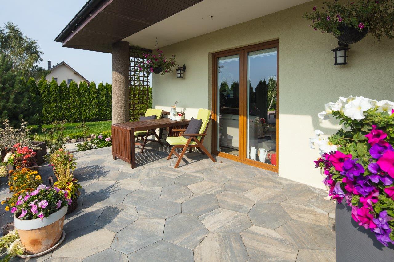 Zwolennikom bardziej tradycyjnych rozwiązań, którzy nie są przekonani do odważnego designu lub wielkiego formatu, do budowy nawierzchni tarasowej można polecić mniejsze elementy. Ciekawym rozwiązaniem aranżacyjnym jest wykorzystanie kostek lub płyt o różnych wymiarach proponowanych w ramach jednej linii produktowej. Stwarza to możliwość realizacji interesujących układów geometrycznych oraz ułożenia swoistej mozaiki. Dobrym przykładem takiego rozwiązania jest kostka Polbruk MultiComplex. Jest ona dostępna w trzech wymiarach: 60×40 cm, 40×40 cm i 20×40 cm oraz gładkiej fakturze. Do modnych szarości należy tu kolor nerino. MuliComplex pozwala tworzyć nieoczywiste kombinacje z minimalistycznych w wyrazie komponentów. Podobnie dużą swobodę w aranżacji inspirujących wzorów daje płyta Polbruk Oland. Występuje również w trzech wymiarach 14×28 cm, 14×42 cm oraz 14×56 cm i aż czterech odcieniach szarości: białym, nerino, stalowym i bazaltowym. Ważną cechą płyt Oland, o której warto wspomnieć jest to, że oprócz układania w sposób klasyczny (naprzemiennie), można ją też układać w jodełkę. Dzięki temu może odwzorowywać na tarasie parkiet.