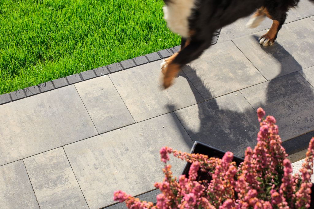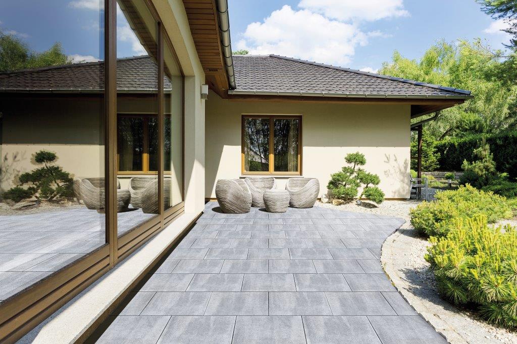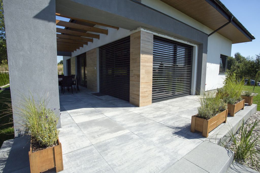 Niesztampowy design w połączeniu z szarością nie jest jedynym pomysłem na modny taras przy domu. Niezwykle popularne są również wielkie formaty, czyli płyty takie jak Polbruk Magna lub Lamell. Posiadają one geometryczny, prostokątny kształt oraz minimalistyczny charakter, który doskonale komponuje się z nowoczesnymi, a także bardziej klasycznymi aranżacjami. Magna to jedna z większych płyt betonowych dostępnych na rynku. Posiada wymiary: 100×75 cm i 50×75 cm. Wśród dostępnych kolorów znajduje się melanżowa szarość nerino. Alternatywą może być płyta Polbruk Lamell. Ma nieco mniejszy format: 60×40 cm i jest dostępna w gładkiej fakturze w dwóch odcieniach szarości – nerino i stalowym, natomiast w płukanej – w melanżowym kolorze ritmo_d. Porównując oba wielkoformatowe rozwiązania, należy zaznaczyć, że płyta Lamell, ze względu na grubość 4,5 cm, jest dedykowana nawierzchniom tarasowym, natomiast płyty Magna można zastosować również na podjazdach czy placach. Wynika to z dostępnych grubości 8 i 10 cm. Grubość 8 cm może być stosowana w ruchu samochodów do 3,5t; a 10 cm – w przypadku ruchu pojazdów powyżej 3,5t.