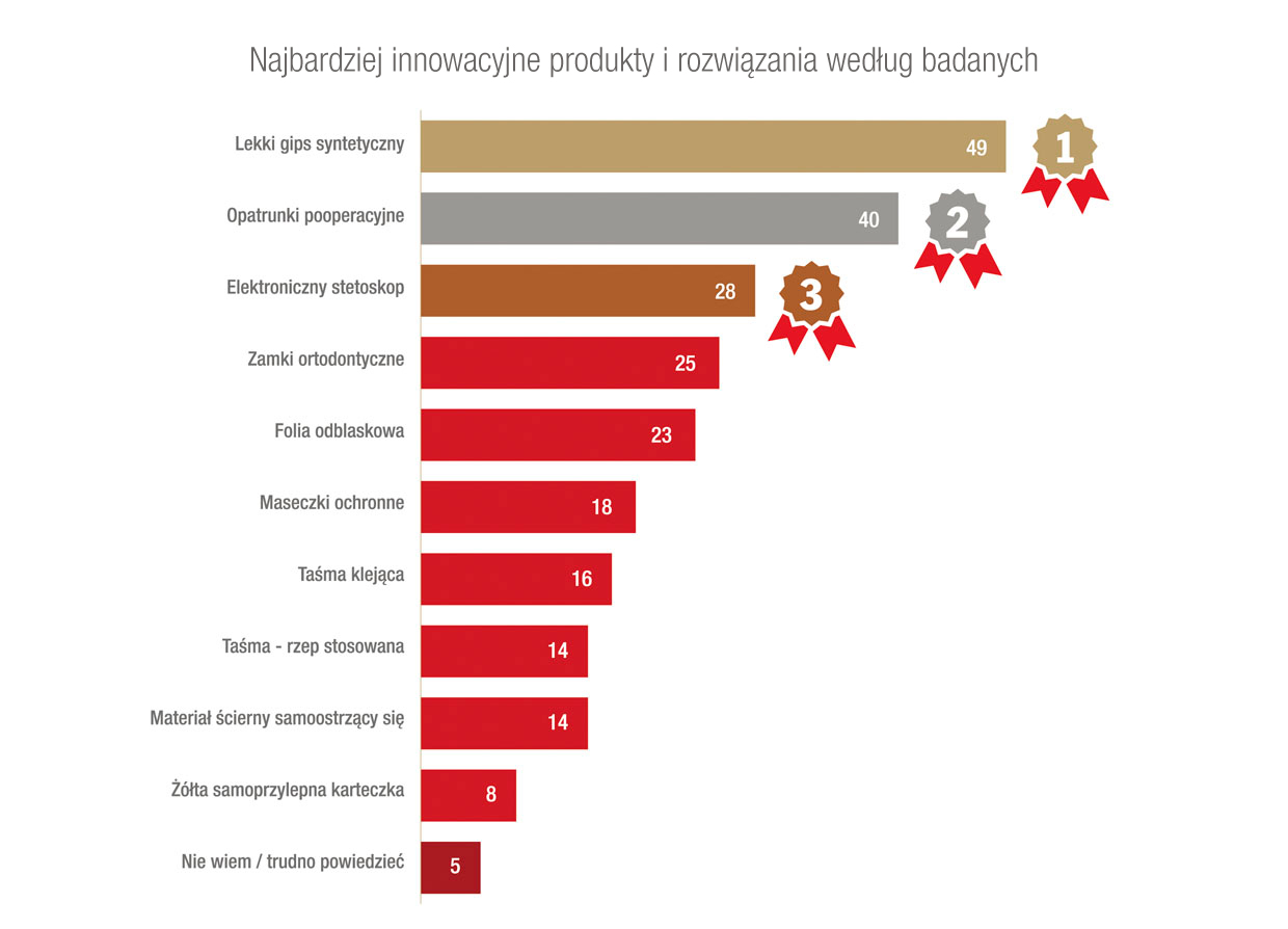 Na drugim miejscu (40 proc.) znalazły się opatrunki pooperacyjne zmniejszające ryzyko zakażeń. Na trzecim miejscu pojawił się elektroniczny stetoskop, umożliwiający diagnozowanie pacjenta i osłuchiwanie pracy jego serca na odległość (28 proc.). Niewiele mniej uznania zyskują zamki ortodontyczne poprawiające zgryz i stan zębów (25 proc.).