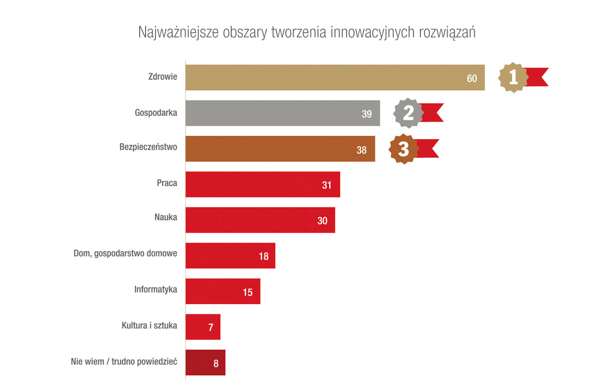 Na kolejnych pozycjach znajdują się gospodarka (39 proc.) i bezpieczeństwo (38 proc.), a także praca (31 proc.) i nauka (30 proc.). Znacznie rzadziej ankietowani wspominają o innowacjach z obszaru domu i gospodarstwa domowego (18 proc.), informatyki (15 proc.) oraz kultury i sztuki (7 proc.). W odniesieniu do priorytetowych obszarów innowacyjności opinie kobiet i mężczyzn są podobne.