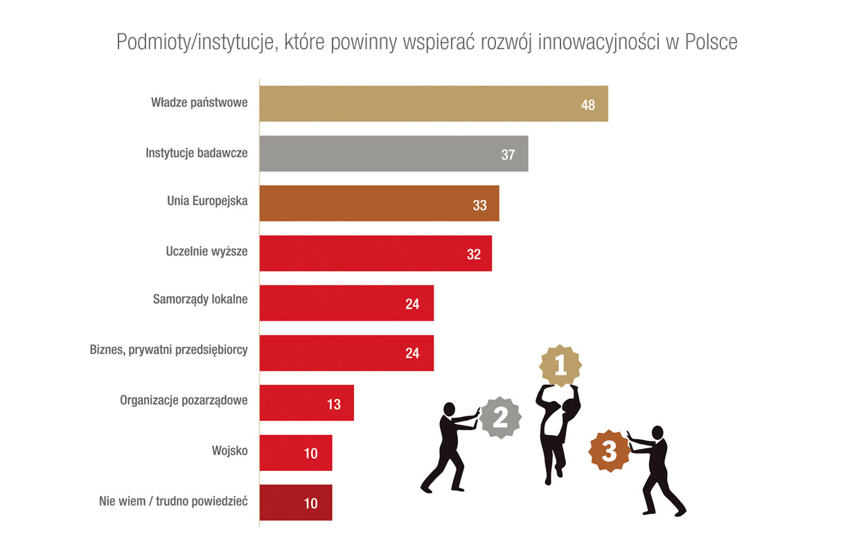 Kto powinien być odpowiedzialny za rozwój innowacji w Polsce? W opinii badanych bezsprzecznym liderem rankingu podmiotów i instytucji, które powinny wspierać taki rozwój, są władze państwowe. Wskazuje na nie niemal połowa ankietowanych (48 proc.). Na drugim miejscu znajdują się instytucje badawcze (37 proc.), a na trzecim Unia Europejska (33 proc.) oraz uczelnie wyższe (32 proc.).