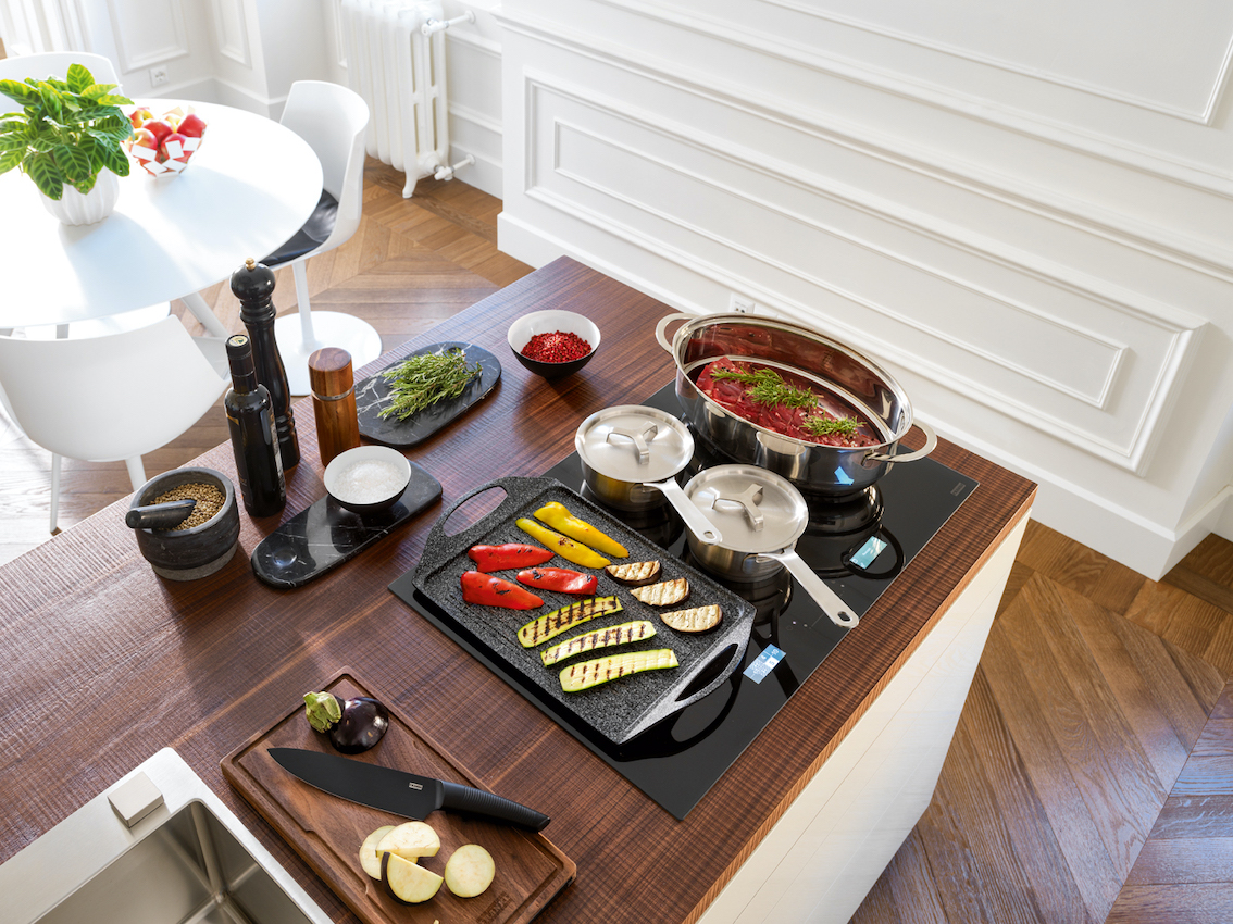W przypadku płyty indukcyjnej Franke mamy szeroki wybór modeli, od standardowych o szerokości 65 cm, po duże 77 cm i małe dwupolowe modele o szerokości 30 cm. W każdej połączymy dwa sąsiednie pola w jedno duże, idealne dla długich naczyń. Wszystkie nowe płyty indukcyjne Franke mają też możliwość zamontowania na równi z blatem.